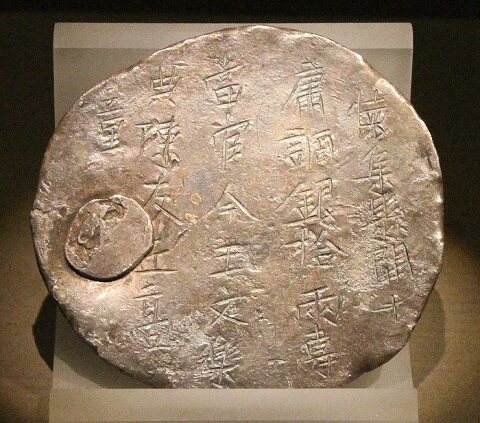我这块铸于开元十年(722年)的10两银饼,正是当时岭南道怀集县用庸调布帛变换成白银,并冶铸成重量标准的银饼,最终输入国库的。如果您仔细看,还会发现我的表面有个圆形“补丁”,这是为了补足银饼的重量而后添上去的。因为唐朝税收库银的征纳每一块都有严格的重量标准,入库即需进行严格监审,若有不足就要及时添补。